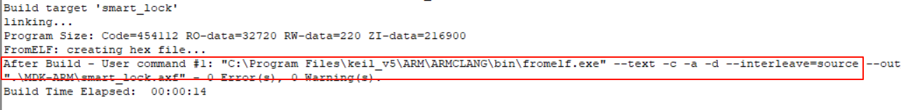 当然手动也是一样的 在 smart_lock.axf文件的目录下输入下面指令即可,当然fromelf.exe要换成自己的地址,另外值得注意的是,&这个符号需要有,& 是PowerShell中的调用操作符(Call Operator),用于执行命令、脚本或表达式。当可执行文件的路径包含空格时,PowerShell需要 & 来正确识别这是一个要执行的命令