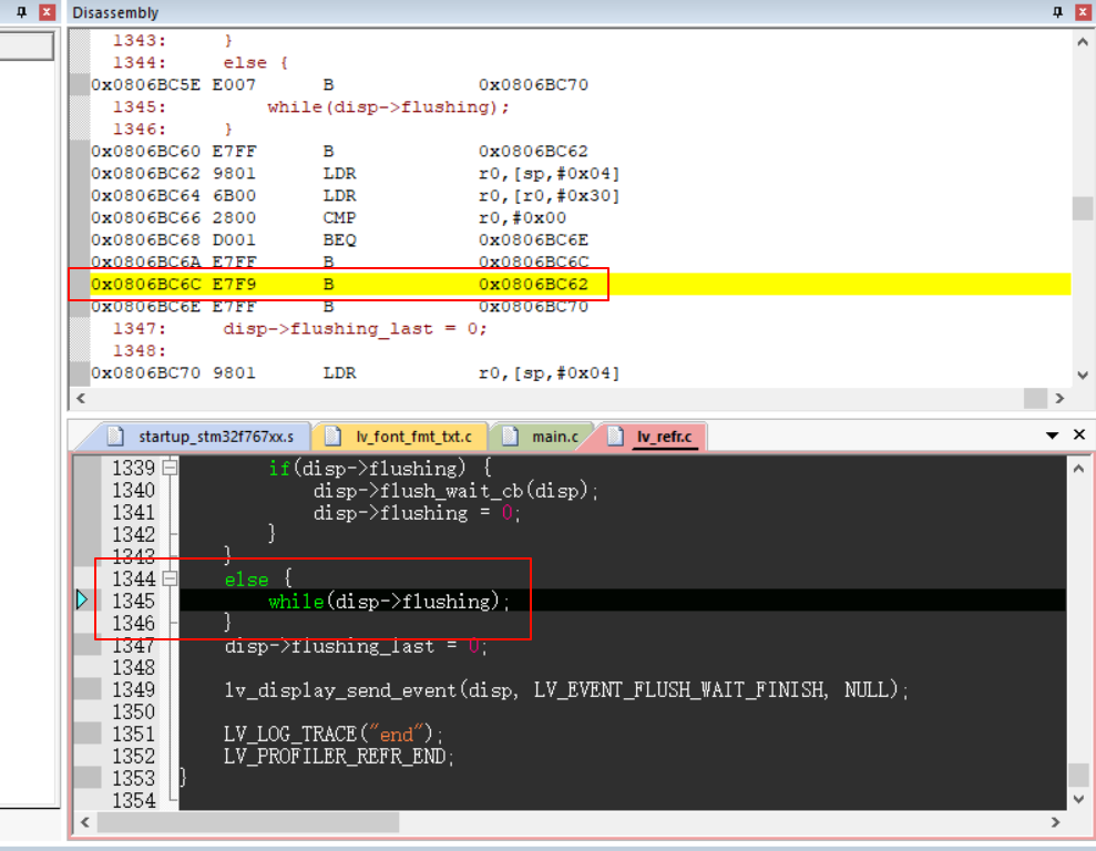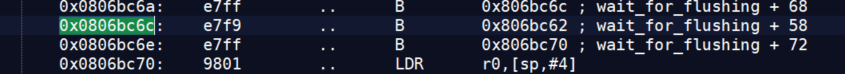 如果大家生成反汇编文件,可能会和我一样遇到一个这样的问题,就是在反汇编文件有些汇编能精确到具体的代码行,有些只能精确到函数,我也做了许多尝试,包括反汇编时的–interleave=source参数 以及keil 设置里面的Misc Controls 添加 -g 参数生成最完整的debug tables信息,但是无法做到像在keil里面进行debug时,cisassembly 基本都能精确到代码行,所以无奈之下,如果要精确到具体的代码行,可以选中调试模拟器,之后点debug,搜索通过反汇编文件找到的函数,如上面的wait_for_flushing,再往下一找就能够找到具体的代码行了,另外如果是用GCC编译,他的 addr2line 指令更加好用,主要还是看自己的编译环境选择工具。