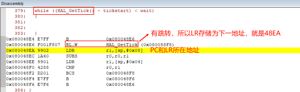 1、是 LR = 0x080048EB ,PC = 0x080048EA LR减去thumb bit 实际上PC地址一样 ,这个就比较奇怪,怎么会一样呢我当时很诧异,后来仔细看原来是死在循环的地方,并且这个循环里刚好有个函数调用,所以LR 和PC地址就一样了,这个也说明死机时实际是在 HAL_Delay 的这个循环里。我在实际调试时经过删减代码及加日志等方法确认HAL_Delay 确实是直接到触发因素