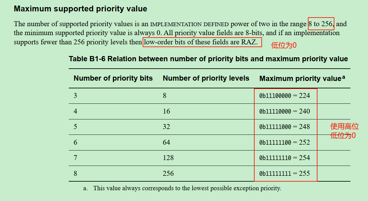 这个0X50代表的意义实际上要根据不同芯片的最大支持优先级的数量来分析,不同芯片的支持的最大优先级数量是不同的,范围在8~256之间,占用的位数是3~8bit 且实际用的位为高位,比如支持优先级为16 占用4个bit,则使用高四位,低四位不使用,我是用的是cotex-m7, 查询架构手册《Arm®v7-M Architecture