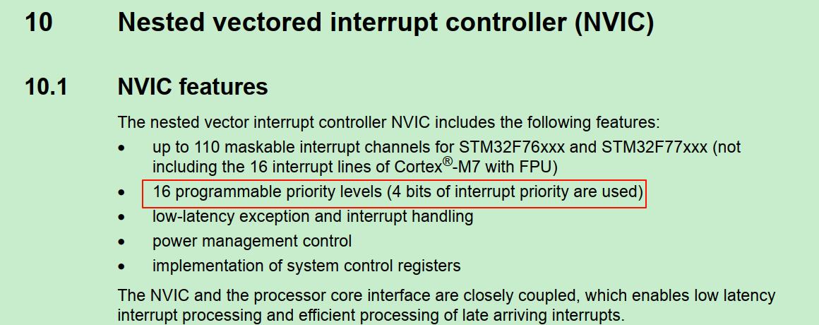 所以我需要查询我使用的具体的芯片手册才知道我有几个优先级,以及屏蔽的是什么优先级,我项目中使用的是STM32F767,所以查询我的芯片手册的NVIC一章可以看到如下内容,也就是我的芯片支持16级优先级,使用的是高4位