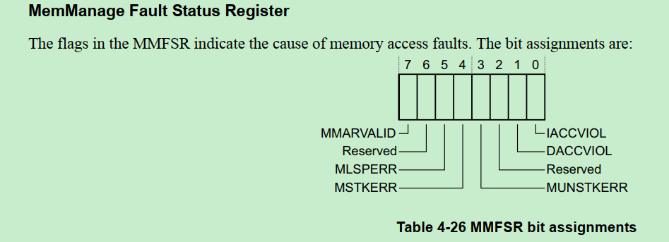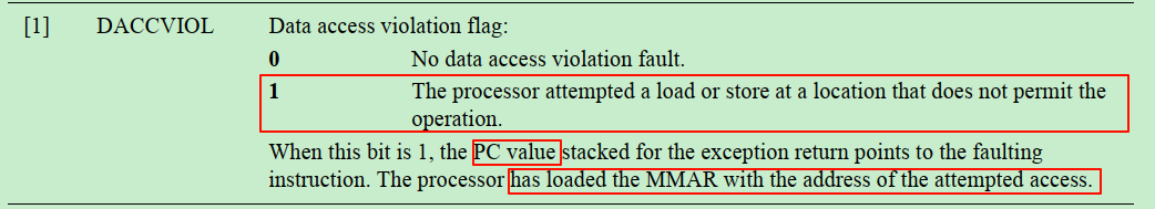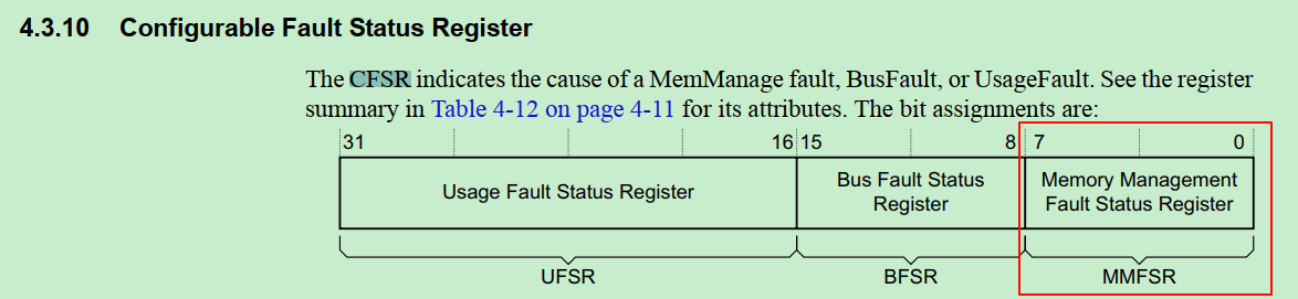首先 CFSR的值为 0x00000082 最小的字节有值,也就是MMFSR有值,首先要阅读内核文档,查看《Arm Cortex-M7 Devices Generic User Guide》的4.3.10 Configurable Fault Status Register 一章寄存器值的具体意义