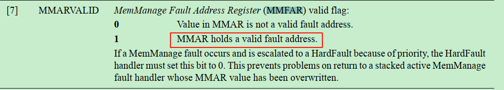 ├─ Bit 7 (MMARVALID) = 1 ← MMFAR寄存器包含有效的故障地址