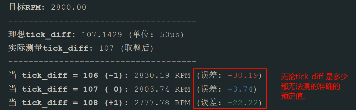 比如如果我预设速度为2800,那么根据公式可知 tick_diff = 300000 /2800 =107.142 857 1 ,但是tick_diff必须是整数,因为它是pwm中断的次数,也就是代表无论如何都无法得到一个准确的2800的测速值,那么在PID调控中,它就会在周围波动,极有可能测速时的tick_diff 是106 107 108 三个值。另外既然有了公式,那么实际上我们可让ai给我们编写一个网页用来将所有RPM下的误差计算出来,并绘制出误差曲线,这样我们就可以较为直观的看到不同转速下的误差情况。