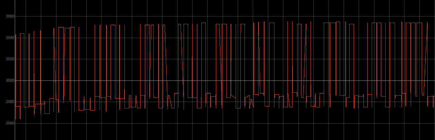 从细节上看,可以看到在3000RPM误差在±60RPM,比预测的要大一倍左右,为什么会这样呢?按理说tick_diff 在±1也就是在3000RPM时大概在±30左右才对。其实原因在于转子的机械误差,比如我的四电极转子有四个磁极,它们不可能是完全准确的90°均匀分布的,肯定会有些误差的,这个就导致了问题,我会在下面的定时器测速中讨论到这个问题。