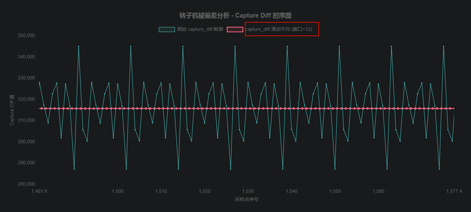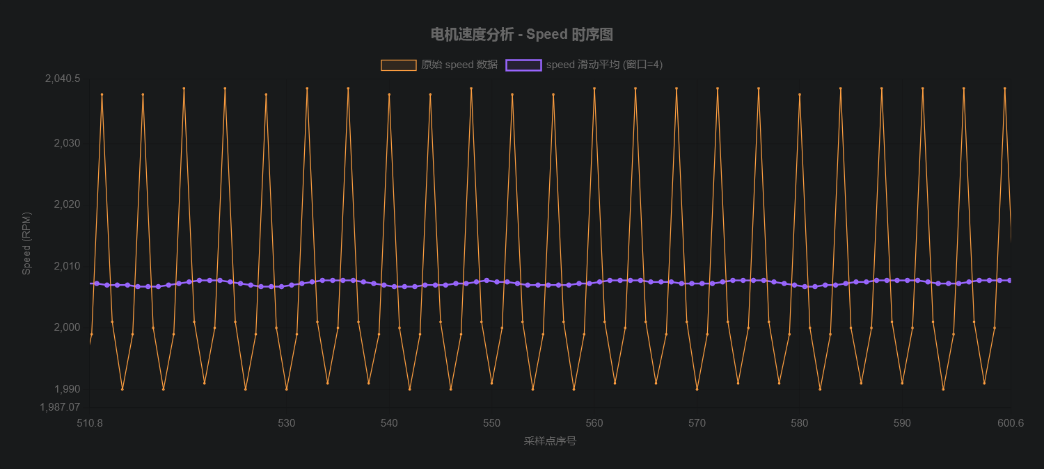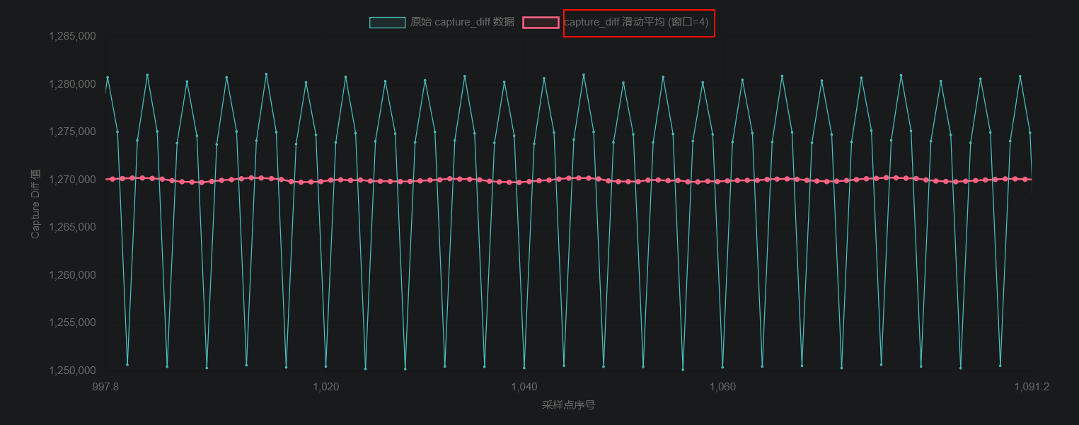 前面说BLDC (无刷直流电机) 的四电极转子不可能完全精准地以 90 度均匀分布,会存在机械偏差,但是怎么证明呢,之前我们有pid调整,引入了变量,那么我以固定PWM占空比,也就是固定的定时器CCR值来驱动空载的电机,然后将每次中断捕获的值列出来,用曲线展示,同时做滑动窗口平均 ,因为我们是四电极和单HALL测量,所以窗口=4